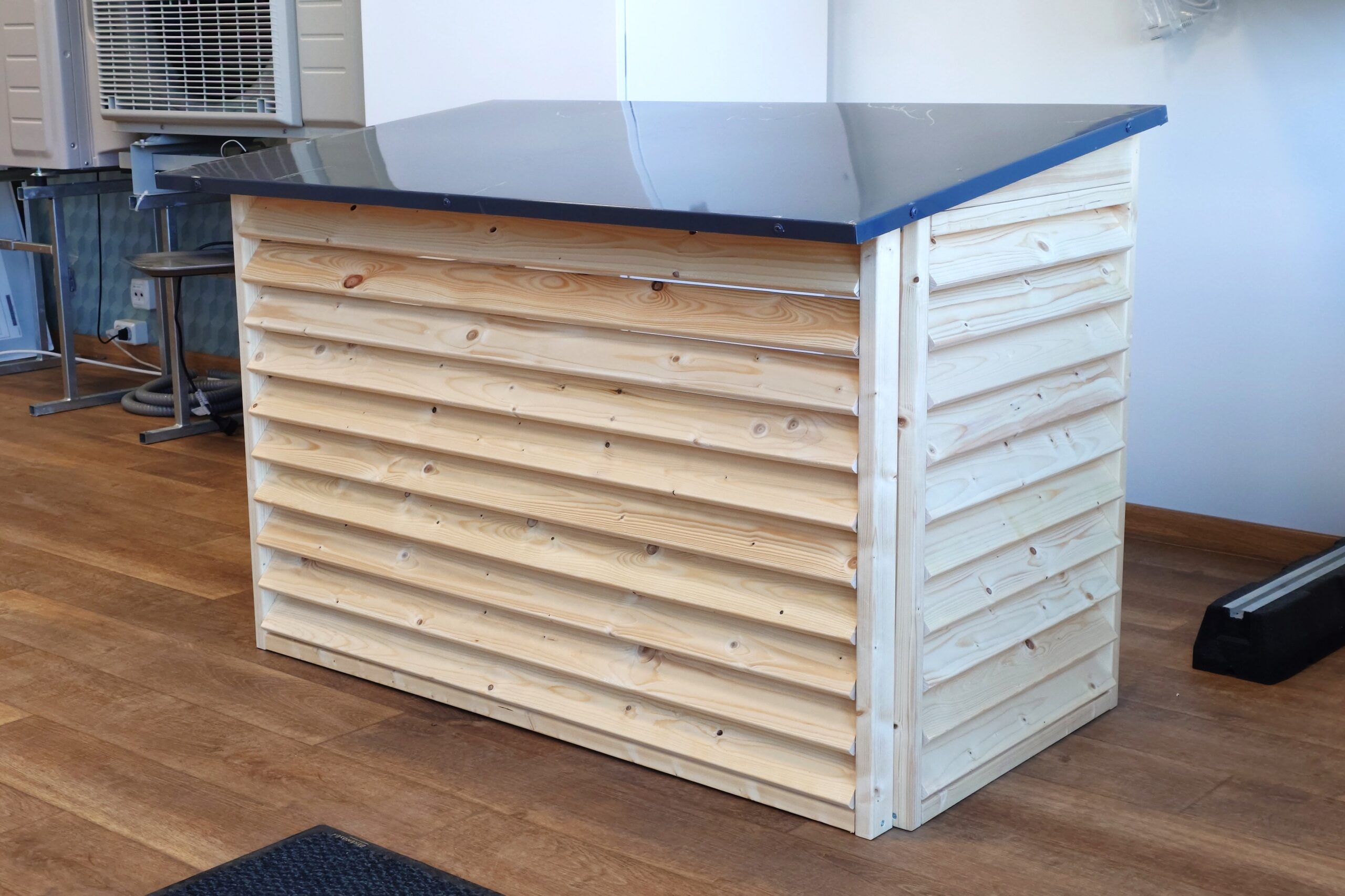 Puidust kate soojuspumba/konditsioneeri välisosale.